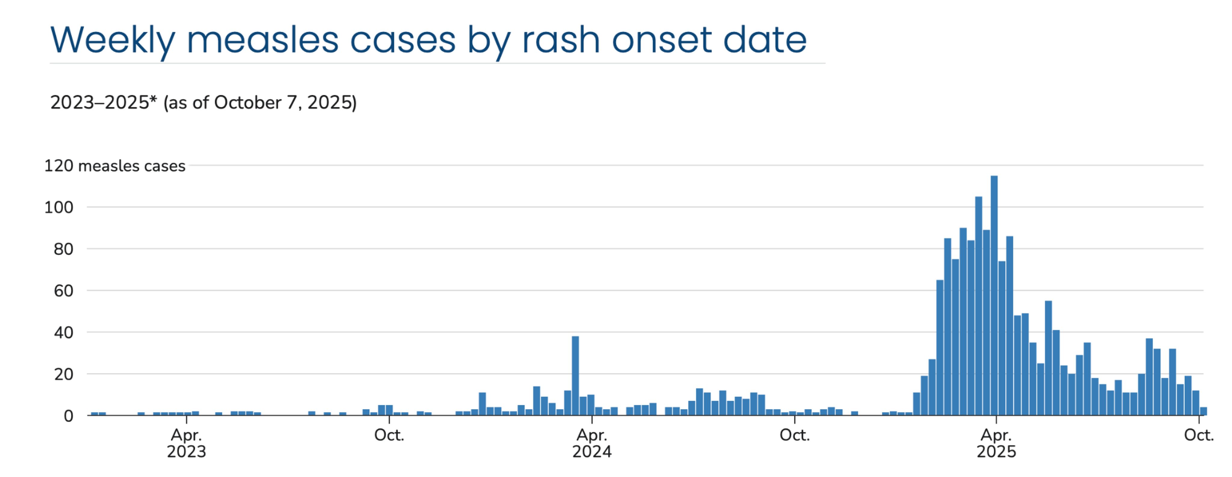 «С 1 января по 17 апреля 2025 года в США было зарегистрировано 800 случаев кори — это второе по величине годовое число за последние 25 лет. 82% случаев были связаны с продолжающейся вспышкой в сплоченных сообществах с низким охватом вакцинацией в штатах Нью-Мексико, Оклахома и Техас. 85 человек (11%) были госпитализированы, трое умерли», — говорится в еженедельном отчете CDC.